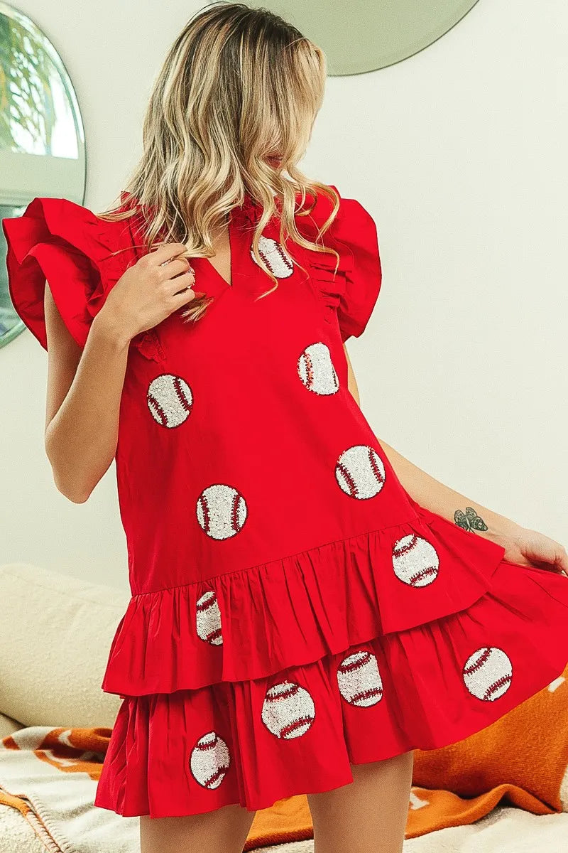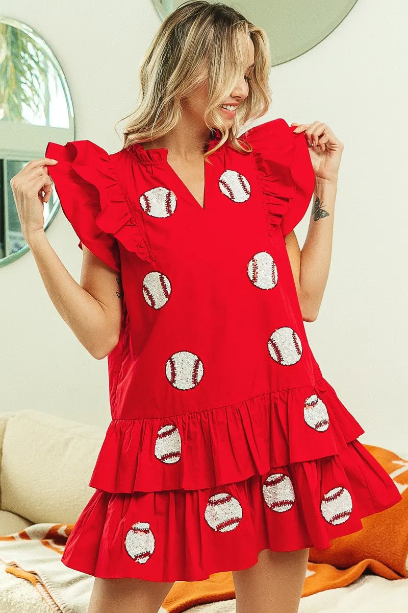 This Sequins Baseball Patch Gameday Dress is a fun and trendy choice for sports fans. With its sequin embellishments and baseball patch detail, it adds a touch of sparkle and team spirit to your wardrobe. Perfect for gameday or any casual outing, this dress is sure to make a statement!