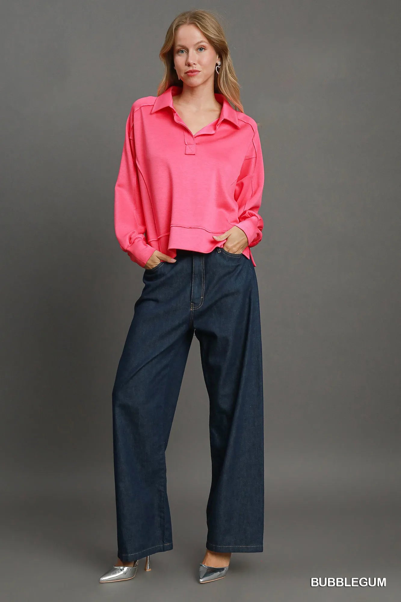 Umgee Exposed Seam Long Sleeve Polo Top with Side Slit