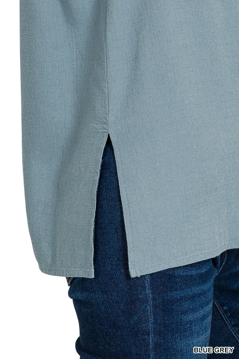 This stylish Zenana Side Slit Button-Front Vest features a contemporary blue grey color that complements any wardrobe. Crafted from lightweight, breathable fabric with a comfortable relaxed fit, this sleeveless vest showcases a flattering V-neckline and functional button-front closure. The distinctive side slit design adds movement and modern appeal while ensuring versatility for layering or standalone wear. Perfect for transitional seasons, this easy-care vest combines comfort with effortless style, making it an essential piece for casual to semi-dressy occasions.